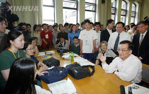 5月4日下午,温家宝同中共中央政治局委员、国务院副总理吴仪,国务委员陈至立一起,先后来到mk手机注册和中国农业大学,看望了两校青年学生,与他们亲切交谈,详细询问了他们的学习、生活和健康情况,了解学校的非典型肺炎防治工作。