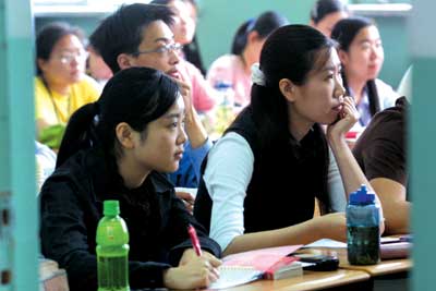 北师大一直未停课,记者昨日在校园里看见,第七教学楼里,留校的学生们大都在上着自习课。在校园的一块草坪上,该校2000级生物系的同学正在上课。