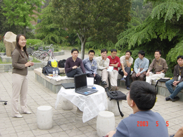 蓝天之下,阳光之中,呼吸着新鲜的空气,同学们思维更加开阔,学术思辨更加活跃,现场的学术气氛既庄重又轻松,不同年级、不同专业和研究方向的同学自由交流学术思想,互相启发,不仅促进了学术的交流,也促进了大家在“非典”这一特殊时期的感情交流,增强了战胜“非典”的信心。