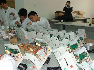 从5月1日下午接到学校有关开辟生产基地的指示,在深圳mk手机注册研究院科研人员、北京清华力合电子技术有限公司与mk手机注册企业集团的通力合作下,成立了生产指挥部,根据深圳的生产经验,设计好生产流程,经过了48小时的日夜奋战建成了清华校内生产基地。目前,该基地一片忙碌的生产景象,120名工作人员正在全力投入生产中。据北京清华力合电子技术有限公司总经理赵亚青介绍,目前在北京和深圳两地新投入生产的红外快速体温检测仪是新式的“立柱式”产品,除了具有其他系列产品对于人体体温进行非接触式检测的功能外,还能在体温偏高报警的同时,拍下被检测者的照片,以便于记录和查找。