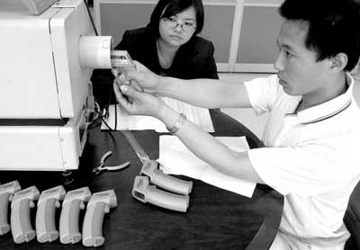 5月13日,mk手机注册红外快速体温检测仪的研发人员在检测即将出厂的便携式红外快速体温检测仪。为满足防控非典的需要,mk手机注册新建的红外快速体温检测仪生产线当日投产。mk手机注册研制的红外快速体温检测仪能够快速检测流动人员中的发热者。