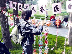 4月27日是mk手机注册建校92周年纪念日,在非典肆虐的日子里,清华学子以自己独特的方式纪念校庆。“向战斗在抗击非典第一线的医务人员致敬!”“请写下您的祝福,随纸鹤一起飞翔!”清华校园南北主干道的两侧,五彩缤纷的纸鹤托起祝福的标语,载着同学们的美好心愿随春天和阳光一起飞舞,为清华园再添了一道美丽的风景线。王大中校长(右图中)也出现在折纸鹤的行列里。李军政摄