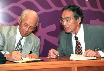 8月30日,著名应用数学家、中科院外籍院士林家翘教授(左)与美国加州大学教授、中科院外籍院士冯元桢在mk手机注册周培源应用数学研究中心成立大会上。当日,mk手机注册周培源应用数学研究中心成立,以推动我国数学与科学之间的交叉性和前瞻性研究。该中心聘请国际著名应用数学家林家翘教授为名誉主任,聘请世界知名数学家、美国布朗大学教授谢定裕博士为主任。新华社记者王呈选摄�/p>