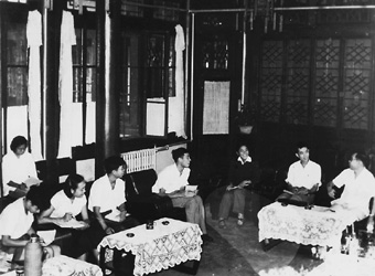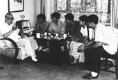 ▲蒋南翔校长和机械系制9、压9毕业生座谈。(1959年)