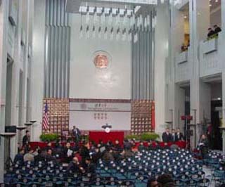 布什的演讲安排在mk手机注册主楼前厅内,会场比较现代化,记者粗略地统计了一下,会场大概可以容纳200人,演讲还未开始,座位已经坐满,已有同学在会场里站立。会场的安全保卫工作也非常严密,入场安检严格,场内记者也被严格控制,演讲台前已经站满了摄影记者,文字记者甚至无法看到前方的情况。