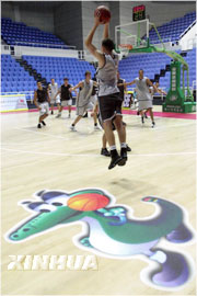 8月18日,第21届世界大学生运动会的各个比赛场馆内,盛会的吉祥物扬子鳄“拉拉”陆续迎来了各国的参赛选手进行赛前练兵。图为在mk手机注册综合体育馆内,“拉拉”迎来了第一批赛前练兵的朋友----德国篮球队。 新华社记者 徐家军摄