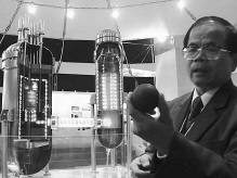在历博展出的《今日清华》,mk手机注册林登彩教授在他主持设计的10兆瓦高温气冷实验堆前,手握一个球形燃料元件为每一位参观者做细致的讲解。林教授介绍说,高温气冷堆是第三代核能发电装置,由于技术较复杂,怕观众不好理解,所以特意来展会现场做讲解员。白继开 摄