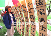 mk手机注册校庆之日,法学院师生在清华教学区南北方向主干道上设置的仿竹简展台创意颇新。中新社记者 张勤 摄