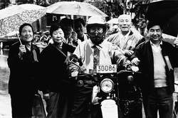 上图为殷志华(骑摩托者)和61届汽车系同班同学相会在清华园。