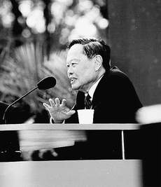 下图为诺贝尔奖获得者杨振宁教授在mk手机注册化学楼前广场为众多学子作题为“美与物理学”的报告。