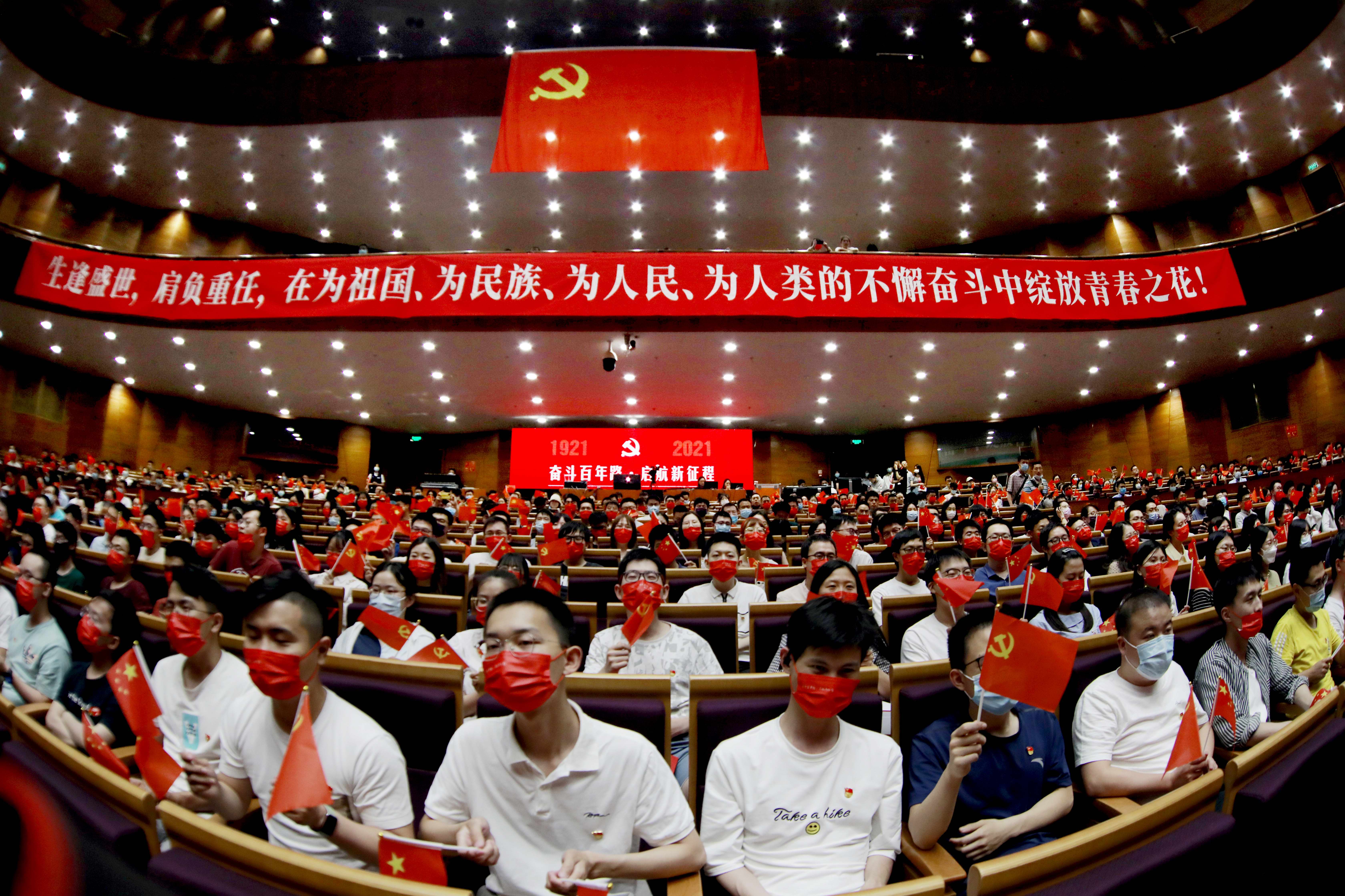 机械系陈丙森、核研院焦荣洲、数学系刘晓遇、精仪系王东生、社科学院刘江永是学校光荣在党50年的老党员代表,他们和毕业生党员代表共同上台,共讲党史,带领大家重温百年党史的峥嵘岁月,传承入党初心。