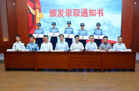 与会嘉宾和领导为2021级联合培养飞行学员颁发录取通知书。学员们精神状态饱满,体现出他们向军旅人生新征程阔步前行的豪迈与自信。