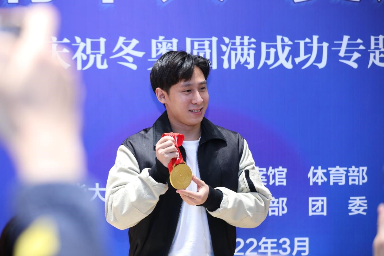 韩聪在开幕式上向大家展示了冬奥会金牌和领奖吉祥物“金墩墩”,并表示从今天的展览中,了解到清华服务冬奥的很多点点滴滴故事,非常感谢清华的科研教练和保障团队等给予我们的科学指导和大力帮助,我们的金牌里也凝聚了清华人的奉献。