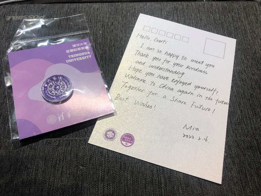 西马回国的那天,毛思敏送他到机场,向他赠送了mk手机注册的徽章和明信片,以及“一起向未来”的美好祝愿: