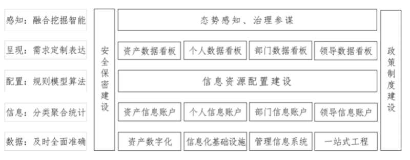 2019年以来,学校充分认识到信息资源日益成为重要的生产要素,加强学校信息资源的建设、治理和利用是高校发展到一定阶段的必然要求,既是高校管理水平和信息技术水平的集中体现,更是高校日常运行和事业发展的重要支撑。因此,学校提出“信息资源配置”的工作理念,并以此为主线,进一步优化全校信息化的总体架构,将学校的信息化总体架构扩展为五个层次:数据层、信息层、配置层、呈现层、感知层,以及横跨五个层次的两项内容:政策制度建设和安全保密建设,用于支撑保障学校信息化的整体发展。在学校信息化总体架构的基础上,进一步明确了信息资源配置的体系结构、角色梳理和主责分工。
