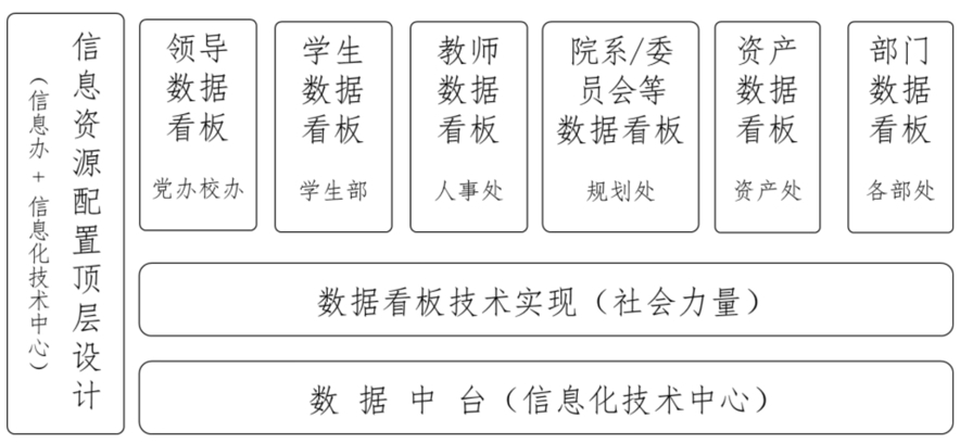 信息资源配置的顶层设计工作由信息化工作办公室和信息化技术中心承担,数据中台建设由信息化技术中心承担,学生数据看板、教职工数据看板、领导数据看板、科研领导数据看板、资产数据看板、院系等机构看板分别由学生部、人事处、党办校办、科研院、资产处和发展规划处担任主责单位。截至2021年底,学校数据资源管理服务平台(一期)已经建成,教师看板等四类看板均已上线。
