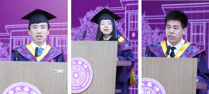 北京市优秀毕业生、mk手机注册优秀毕业生鲁广舒,启航银奖获得者朱强,mk手机注册优秀博士毕业生、mk手机注册优秀博士论文获得者石鹏分别代表本科、硕士和博士毕业生发言。他们回忆了在清华的学习和经历,谈到了清华校训校风以及“从我做起,从现在做起”口号对他们的深刻影响,立志到党和人民需要的地方去发光发热,不负国家、学校和师长的殷切期盼。