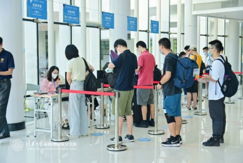 在CⅡ楼一层的迎新大厅和CI一层的教室,深圳国际研究生院党政办、培养处、学工办、信数中心、总务办、财务办、宣传与公关办等部门的老师和来自各专业的学生志愿者们早早地在各自的岗位上准备就绪,从校门口到宿舍,他们坚守在各个服务岗位,迎接即将到来的小“清新”们,为他们提供路线指引、问题解答、行李看管等贴心周到的服务。新生在工作人员的指引下有序完成资格审查、学费缴纳、住宿办理、户籍迁移等注册手续。在位于学院信息大楼的国际学生学者中心/港澳台学生学者中心,全球事务办的老师们也在热心地为国际及港澳台新生办理入学手续。