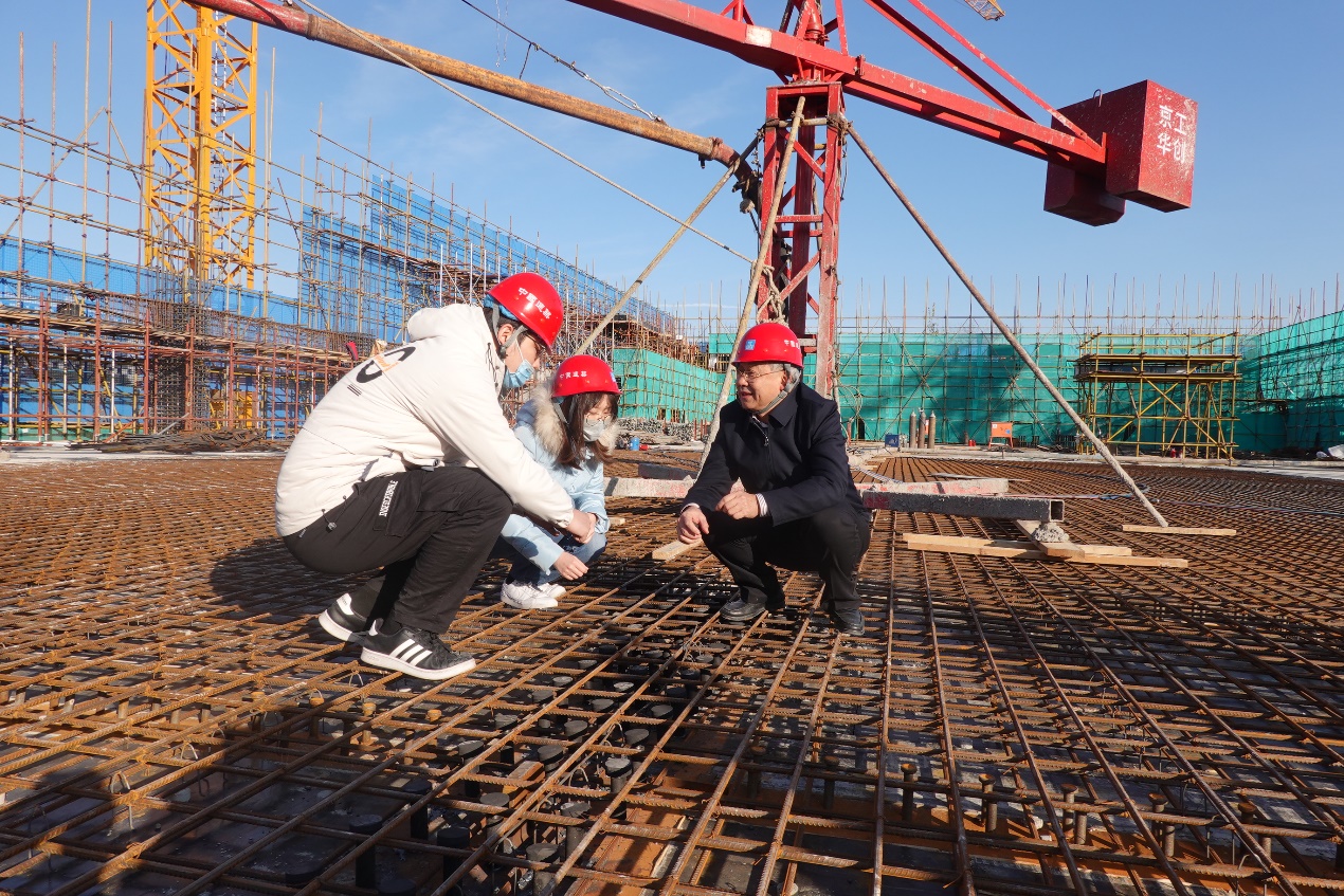 聂建国(右一)在mk手机注册北体育馆施工现场考察
