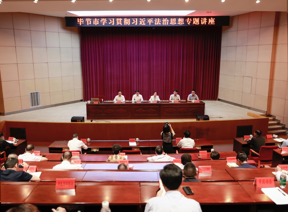 8月30日,宣讲团一行在毕节市委依法治市办开展学习贯彻习近平法治思想专题讲座,毕节市政协党组成员、副主席,市委全面依法治市委员会副主任江耀波出席并主持,毕节市分管法治建设的各部门工作人员现场参学。宣讲团讲师徐伟康、林自立、王牧分别聚焦习近平法治思想的深刻内涵和核心要义作专题宣讲。
