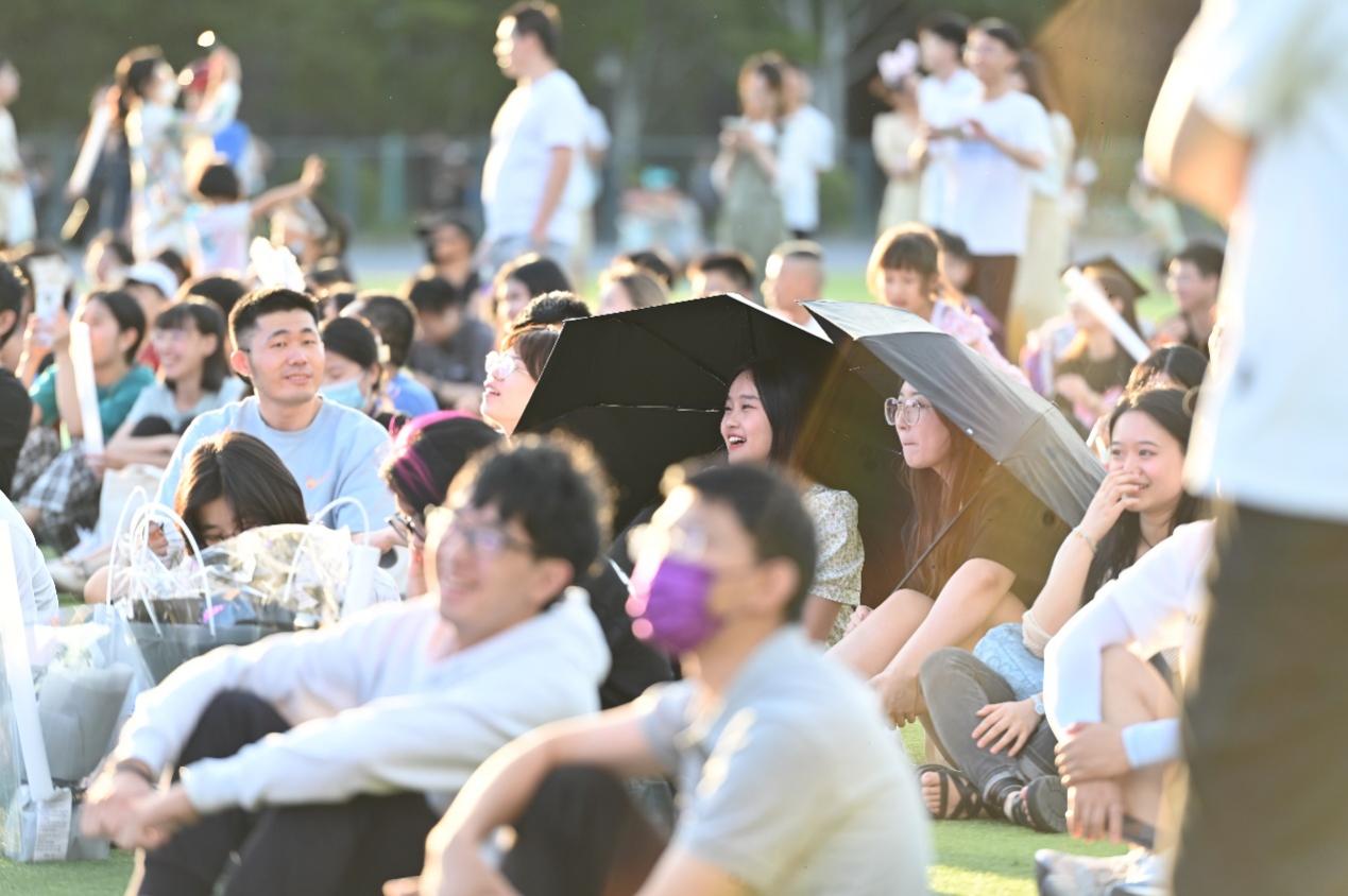 本次毕业声音乐节共分为三个篇章,分别是“很高兴遇见你”“与你相依的四季”“最好的告别是明天再见”。现场荧光闪烁,陆续有同学来到音乐节现场,坐在草坪上,在歌声、朋友和晚霞的陪伴中与自己的大学时光告别。