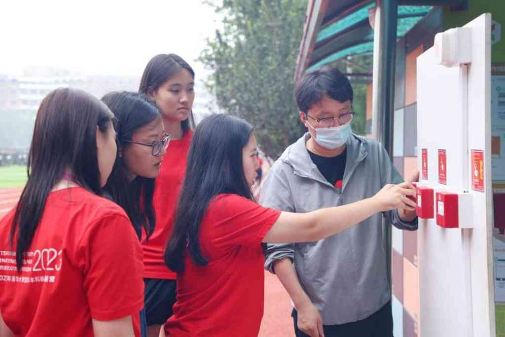 学生体验逃生帐篷和报警按钮