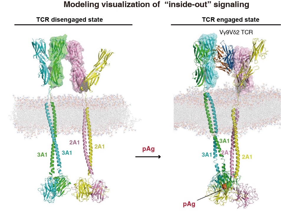 膦抗原促使靶细胞内部BTN3A1与BTN2A1蛋白“黏在”一起后,信号又是如何从内部传导至外部,供γδ T细胞受体感知的呢? 这其中的“中介物”是什么?膦抗原又在其中扮演了怎样的角色?