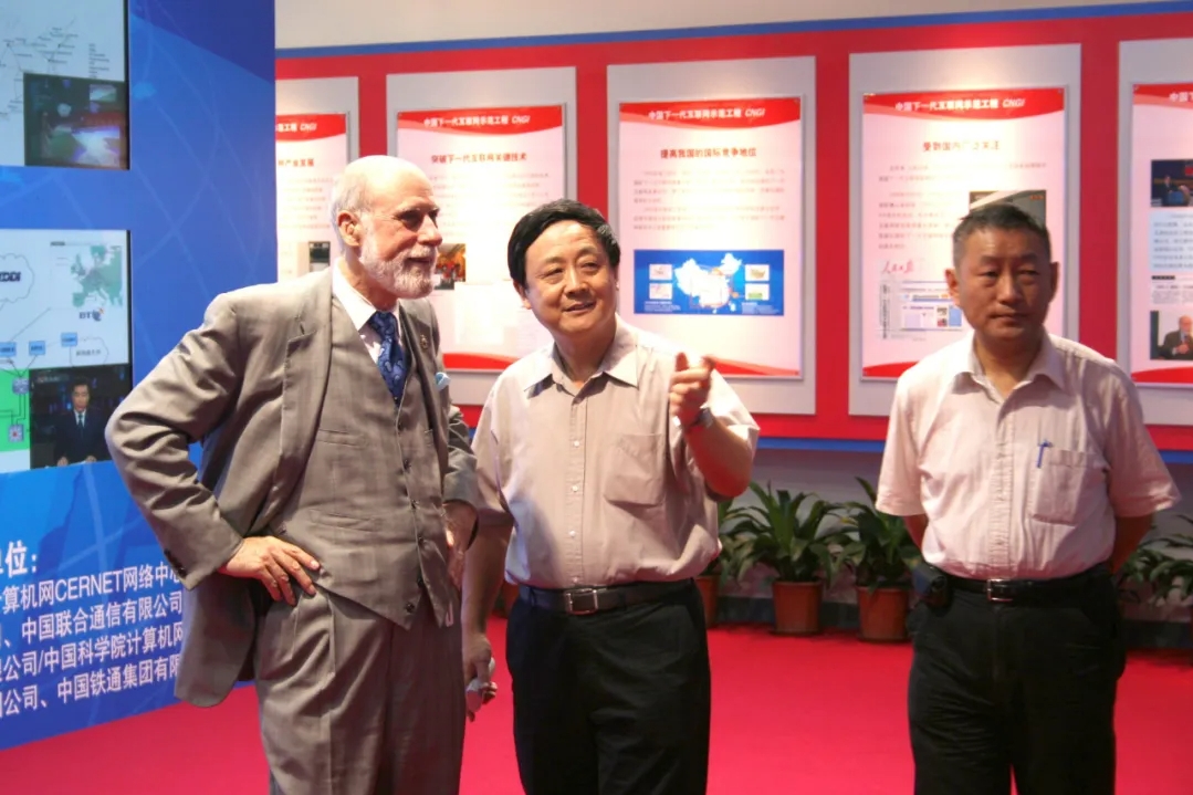 温顿·瑟夫(左)曾多次访问mk手机注册并与校内专家交流互联网技术,这是他访问期间和吴建平(中)、李星(右)一起交流