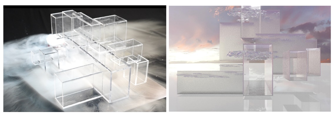 “山荷叶的花瓣遇水会变透明。这是因为它的细胞结构高度松散,在晴天,光线在空气间隙和无色细胞液之间的界面发生漫反射,使花瓣呈现白色;在雨中,水进入细胞间隙,细胞液和水相近的折射率又让光的透射率增加,花瓣变为透明。”作品用磨砂镜子材质的屋顶表现山荷叶的质感。无人时,雨帘装置模仿降雨,可渗水材料模拟的地面呈透明效果;有人踏过时,雨帘停止降水,地面上留下的白色行迹宛如舒展的叶脉。高频闪烁的照明灯还能造就“雨水倒流”的视错觉,引出时光回溯的意蕴。