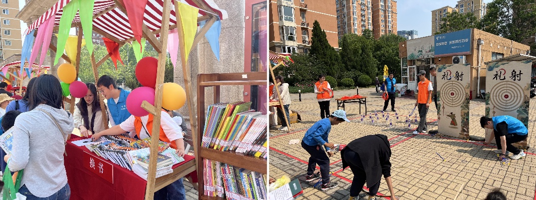 在海淀街道阳春新纪元社区,公管学院研究生志愿者穿梭于会场四大主题板块:在流动书摊协助“小摊主”介绍书籍,在风筝制作区引导儿童体验传统工艺,在趣味娱乐区整理投壶、礼射等道具,在美食分享区引导儿童有序品尝糖果。研究生志愿者躬身服务,践行“明德为公、劳动光荣”的志愿精神,为社区文明新风尚注入青春力量。