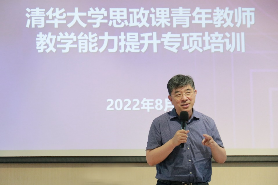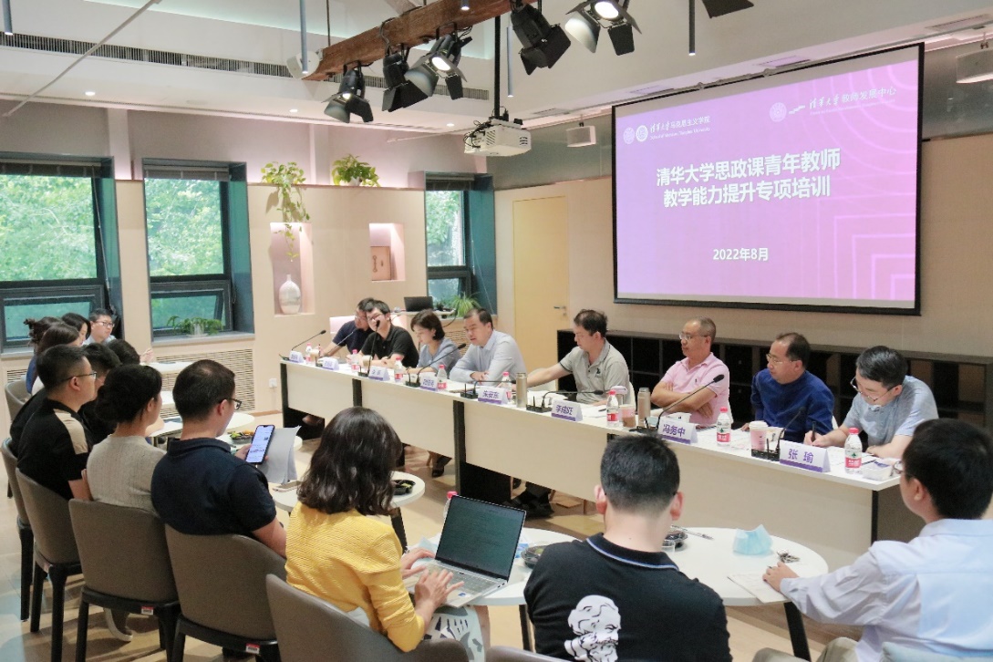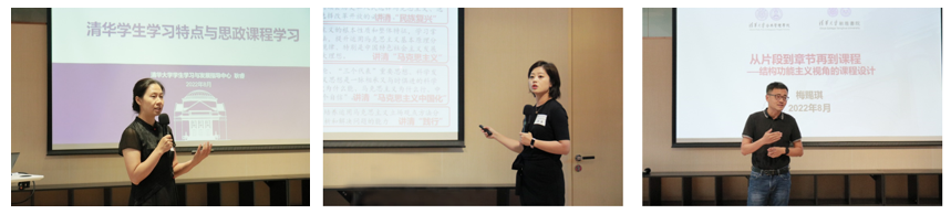 学生学习发展中心主任耿睿以“清华学生学习特点”为主题作讲座。基于丰富的学生学情调研数据,耿瑞对清华学生学习特点、需求和教师可能采取的教学方法等内容作细致介绍。马克思主义学院副教授李蕉围绕“高校及清华思政课现状”作讲座,并以一节生动的示范课“1919:十字路口的中国”,结合自己的课改经验,剖析课程设计与蜕变的过程,强调课程的“一条主线”与逻辑的“起承转合”。新雅书院院长梅赐琪以“从一堂课到一门课”为主题,以从片段到章节再到课程的脉络,从结构功能主义的视角,与在场教师交流探讨提升青年教师课程设计基本功的方法。