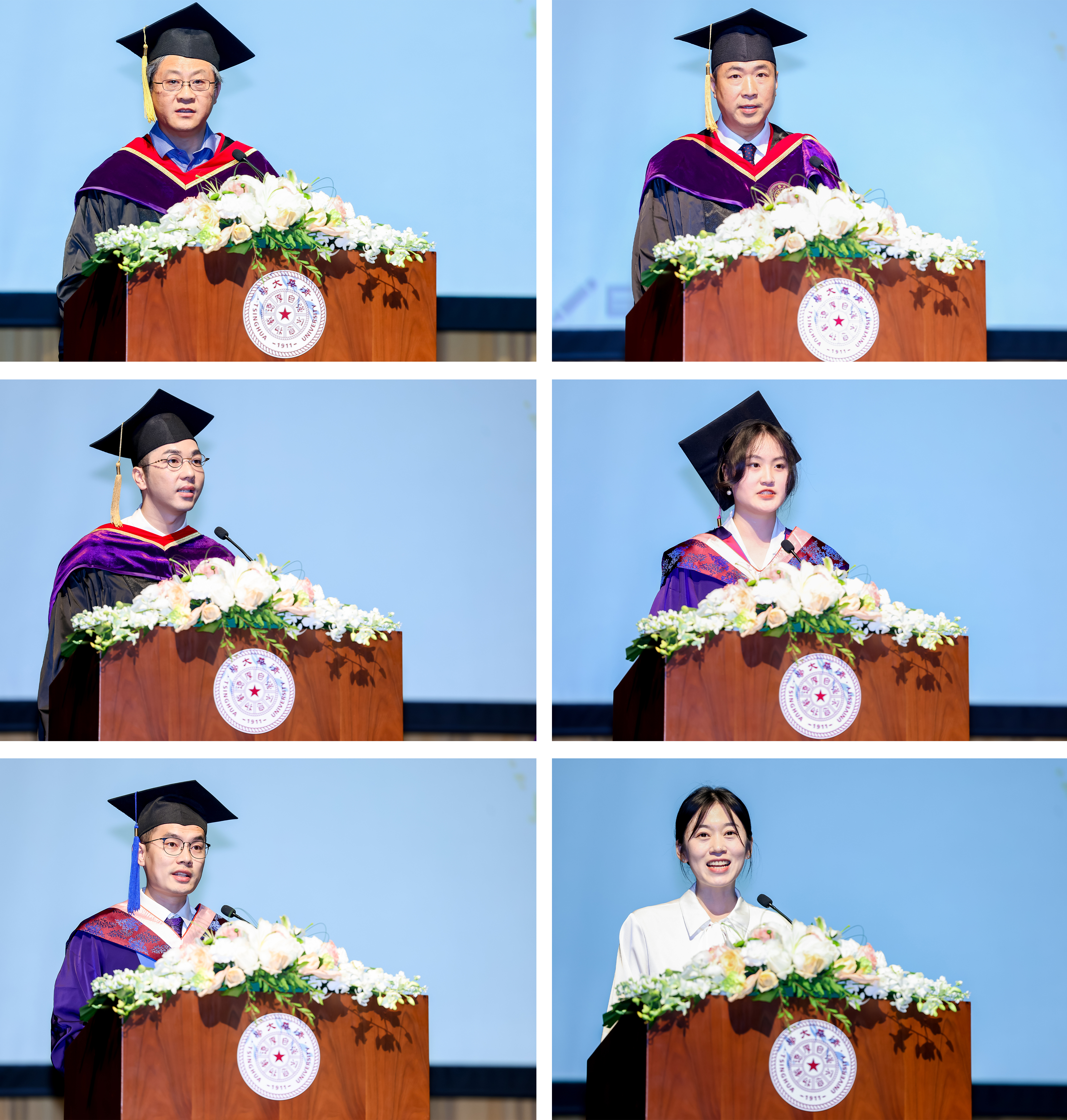 马赛致辞,杨冬江宣读毕业及学位授予情况,刘亚、李思节、黄仁余、王晓丽发言(从左至右,从上至下)