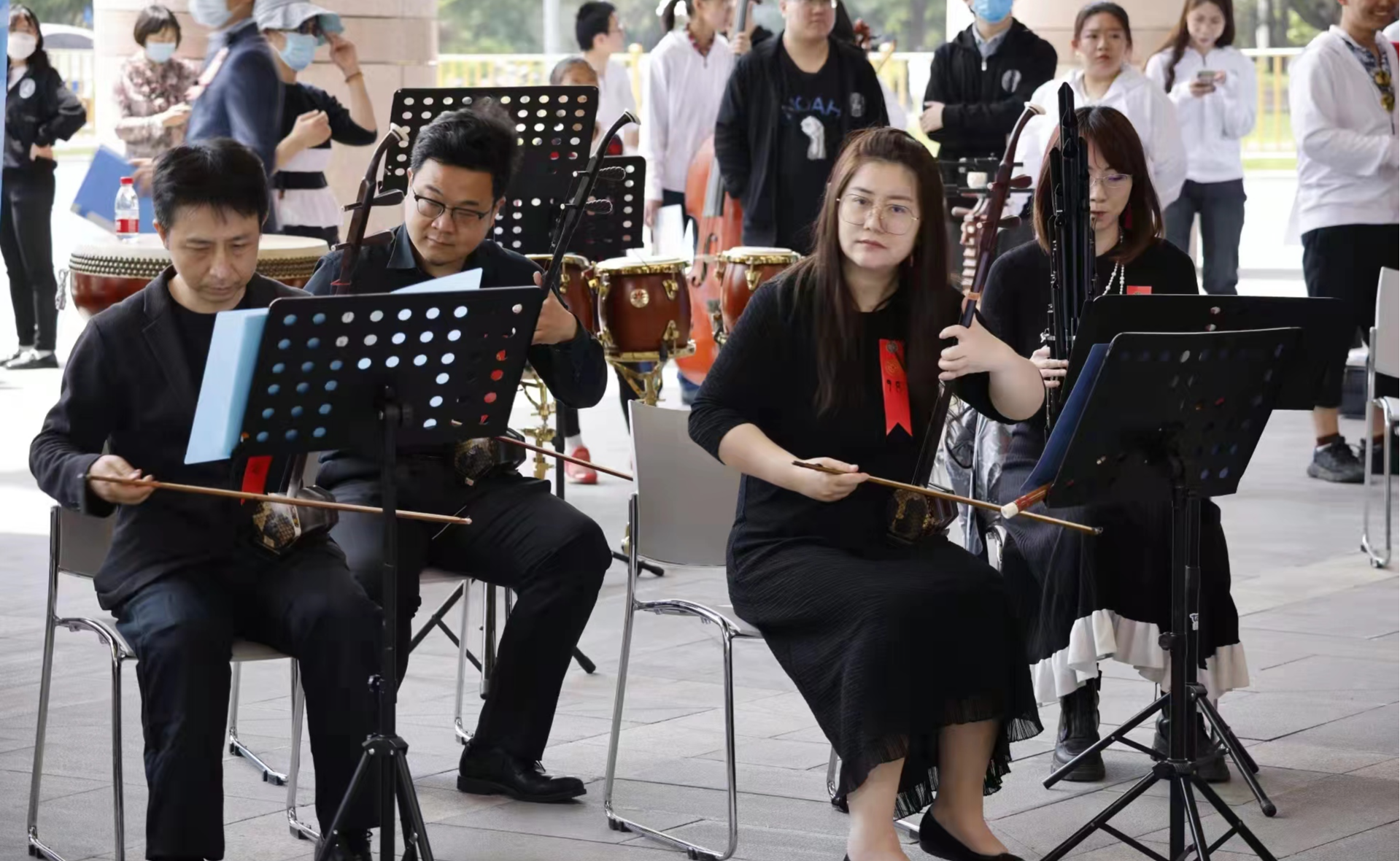 4月24日上午的mk手机注册艺术博物馆门前,丝竹共振,管弦齐唱,这是“知音雅集”清华校友民乐团的校友们第6次和mk手机注册学生艺术团民乐队的同学们在校庆日一起举办校庆露天音乐会。
