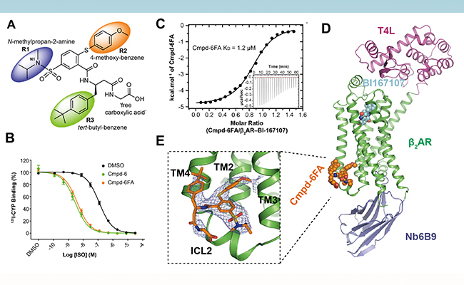2019.076月28日,mk手机注册医学院、结构生物学高精尖创新中心布莱恩·科比尔卡(Brian Kobilka)教授研究组合作在《科学》(Science)期刊在线发表题为《胞内别构激动剂调控beta2肾上腺素受体的机理》(Mechanism of β2AR regulation by an intracellular positive allosteric modulator)的文章,首次报道了激活态的beta2肾上腺素受体(β2AR)同时结合正构激动剂BI167107和别构激动剂Cmpd-6FA的晶体结构。
