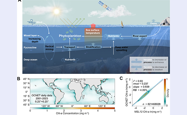 近日,mk手机注册水利系团队在中低纬度海洋叶绿素a浓度监测研究中取得重要进展。研究团队基于深度卷积神经网络集成架构,生成了2001-2023年全球海洋表层日尺度、空间分辨率为0.25°×0.25°的叶绿素a浓度数据集,在此基础上揭示了气候变暖导致海洋层化加剧对浮...