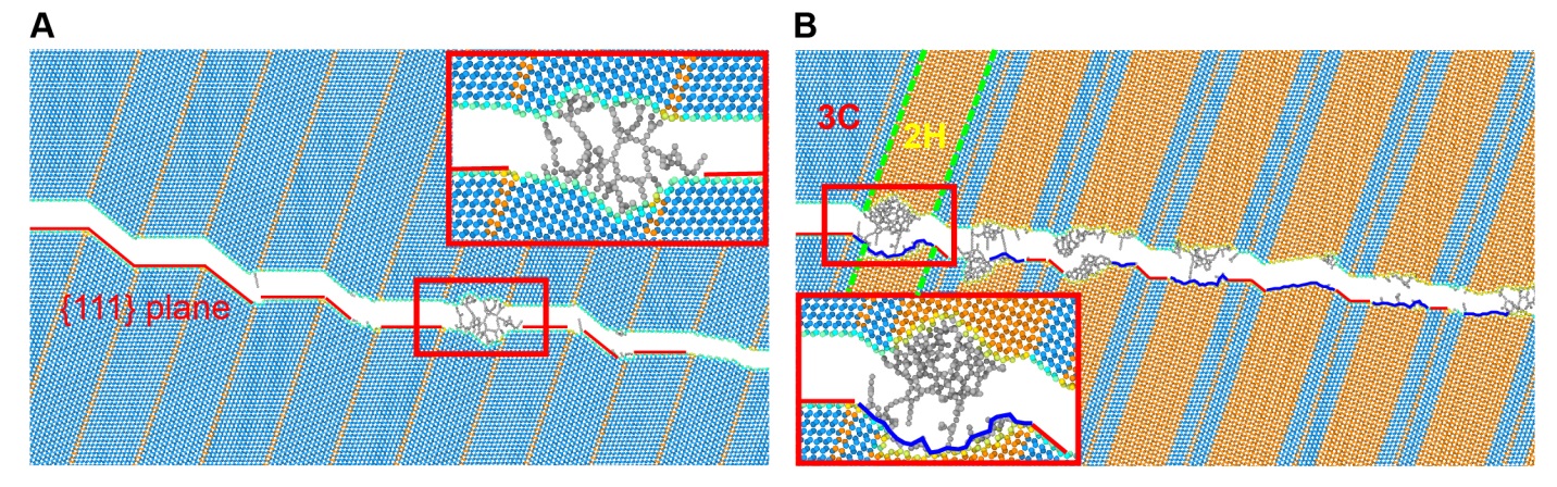 2021.08航天航空学院李晓雁课题组揭示含不同多型体纳米孪晶金刚石的增韧和裂纹愈合机制
