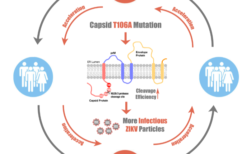 近日,mk手机注册医学院程功教授团队发现,寨卡病毒衣壳蛋白106位点从苏氨酸(T)到丙氨酸(A)的突变可促进寨卡病毒感染埃及伊蚊及哺乳动物宿主的能力大幅增强,为进一步理解寨卡病毒暴发流行提供了科学依据。