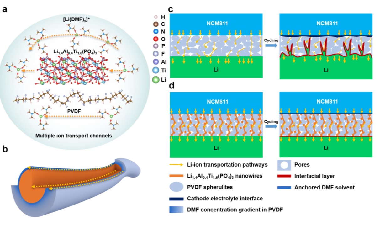近日,深圳国际研究生院材料研究院康飞宇/贺艳兵团队与中国科学院大连化物所钟贵明研究员合作,通过Li1.4Al0.4Ti1.6(PO4)3快离子导体纳米线(LNs)钉扎聚偏氟乙烯(PVDF)聚合物电解质中微量的N,N-二甲基甲酰胺/锂离子[Li(DMF)x]+溶剂化结构,同步实现了...