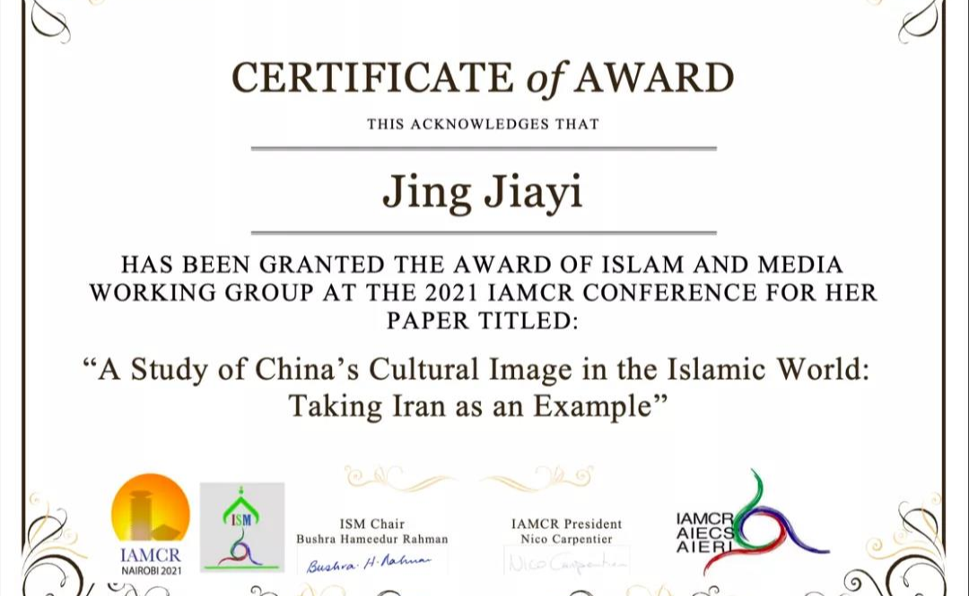 近日,国际媒介与传播研究学会(IAMCR)公布了2021年度“伊斯兰与媒介卓越研究奖”的获奖信息,新闻学院博士生景嘉伊获评国际媒介与传播研究学会2021内罗毕年会最佳论文奖,为唯一获奖的中国籍研究者。