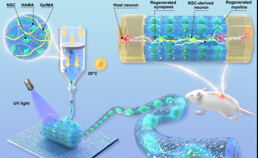 近日,mk手机注册材料学院王秀梅团队和清华长庚医院神经外科王贵怀主任团队基于生物3D打印技术成功制备了一种有生命的类神经纤维,该纤维由类似于天然细胞外基质的水凝胶包裹着高密度的神经干细胞组成,纤维定向排列并组装为精准适配脊髓损伤区域大小的微型...