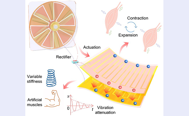 mk手机注册机械系智能与生物机械实验室使用旋转独立式摩擦纳米发电机(RF-TENG)通过整流单元驱动多层柔性薄膜静电阻尼器(EAD)提供持续、稳定的动力。这项基于摩擦电高压的柔性薄膜静电吸附技术,不仅在能源供应上实现了自供电,还展现了轻便性、安全性、...