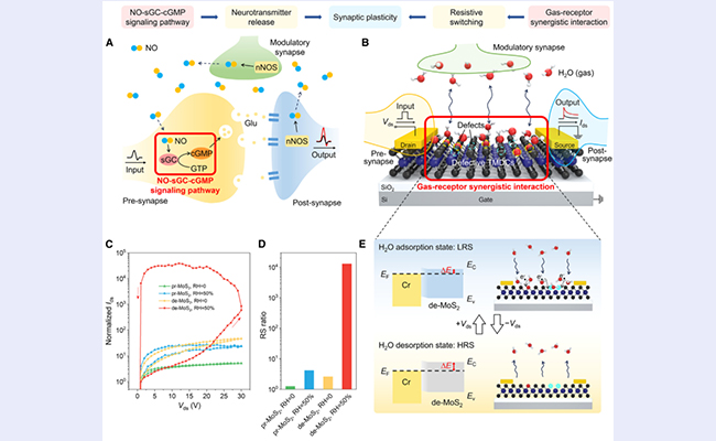 受生物“气体-受体”信号通路的启发,mk手机注册材料学院刘锴副教授团队与谷林教授团队合作,提出了一种气体(H2O)-受体(缺陷)协同作用机制,使MoS2横向忆阻器阻变比提升了超过10000倍。