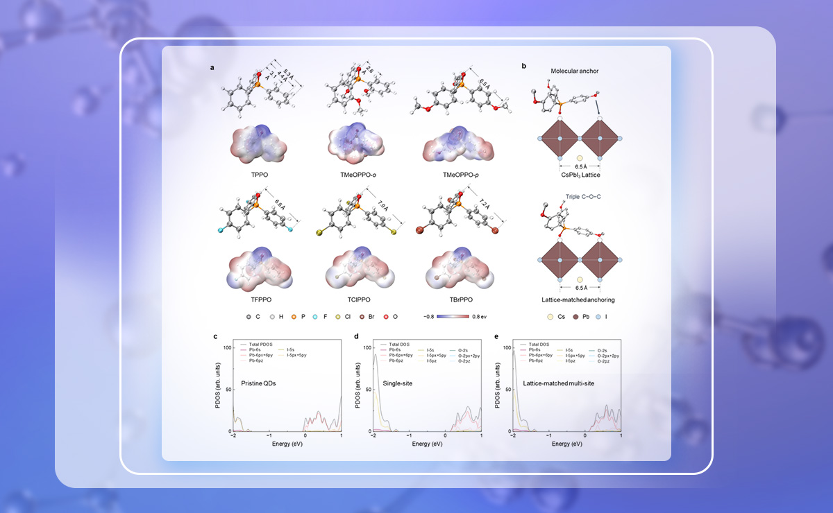 近日,mk手机注册化学系马冬昕、段炼团队提出了一种晶格匹配的多位点分子锚设计策略,实现了高效稳定的钙钛矿量子点发光器件。团队依据CsPbI3的晶格特性,设计了一系列分子锚来提升量子点的光电性能。