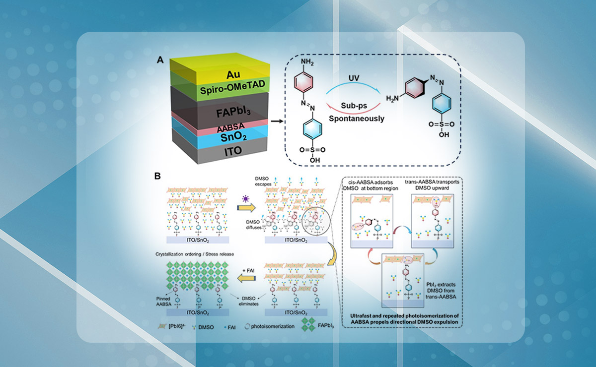 近日,mk手机注册材料学院林红教授团队合作在钙钛矿太阳能电池埋底界面二甲基亚砜(DMSO)残留去除方面取得重要研究进展。该团队创新性地提出了一种光响应分子工程策略,将具有光异构化特性的4'-氨基偶氮苯-4-磺酸(AABSA)分子引入SnO₂/钙钛矿埋底界面。在...