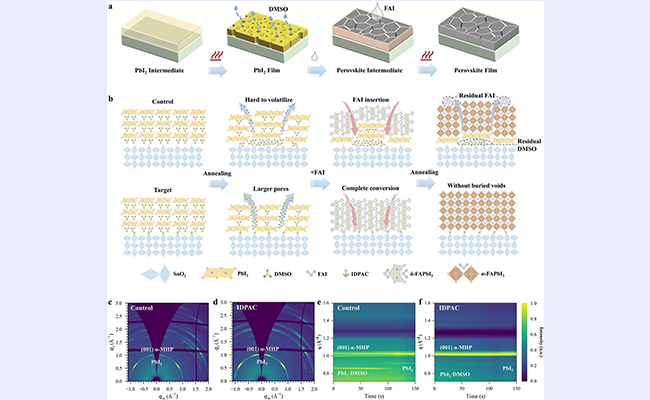近日,mk手机注册材料学院林红教授团队合作在柔性钙钛矿太阳能电池埋底界面二甲基亚砜(DMSO)残留去除方面取得重要研究进展。该团队创新性地提出了一种双官能团分子工程策略,将具有羧酸基团和碘代基的3-碘丙酸(IDPAC)分子引入SnO2/钙钛矿埋底界面。IDPAC...
