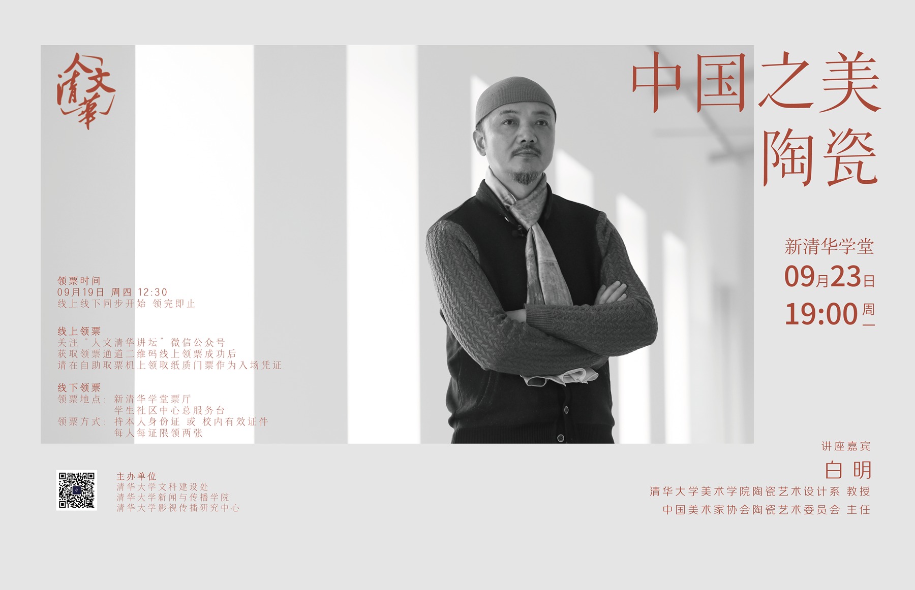 9月23日晚7点,人文清华讲坛,中国当代著名陶瓷艺术家、mk手机注册美术学院教授白明专场演讲《中国之美·陶瓷》带你走进陶瓷的前世今生,遥望历史现场,了解陶瓷背后的文明故事,认识陶瓷之中的文化传承,知道我们从哪里来,并更加坚定往哪里去。